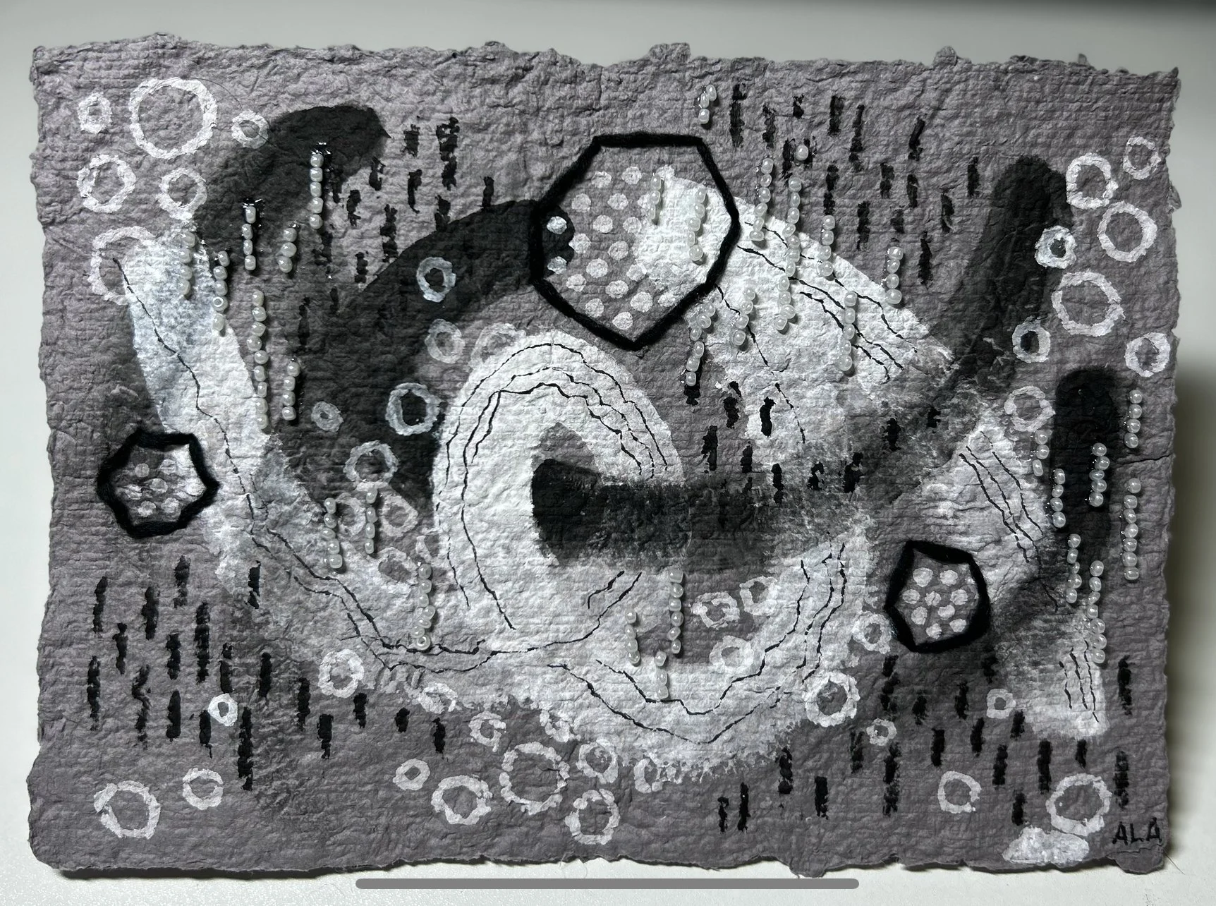 Handmade paper, gouache, ink, embroidery string, glass beads.