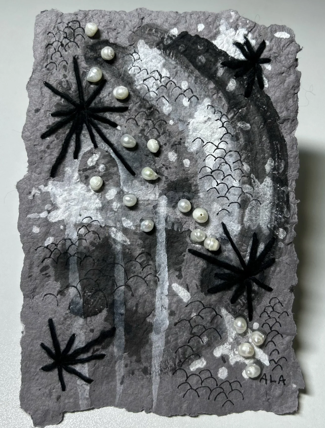 Handmade paper, gouache, ink, embroidery string, glass beads.