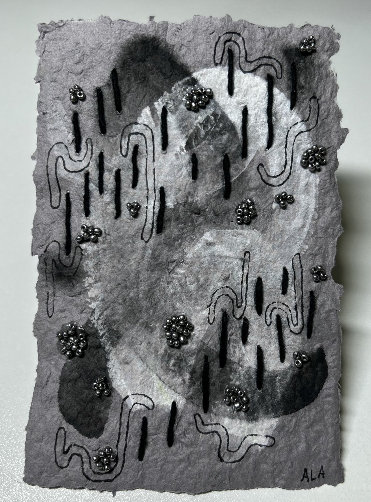 Handmade paper, gouache, ink, embroidery string, glass beads.