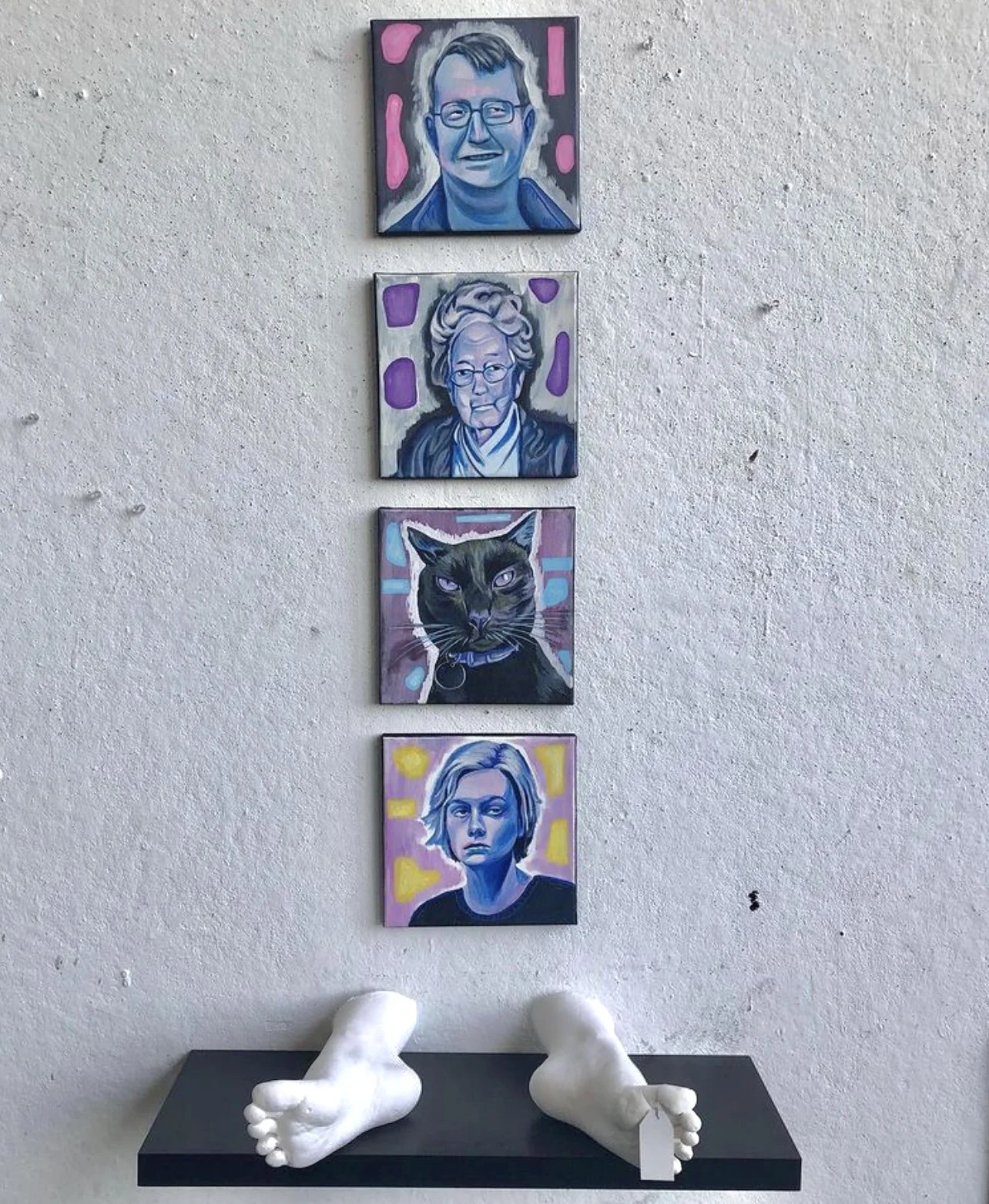 In Memoriam Four 10” x 10” acrylic on canvas portraits and two cement live cast feetApril 28, 2022A memorial to three impactful deaths in my life and a portrait of myself as my hypochondria leads me to believe I’m in those situations as well.
