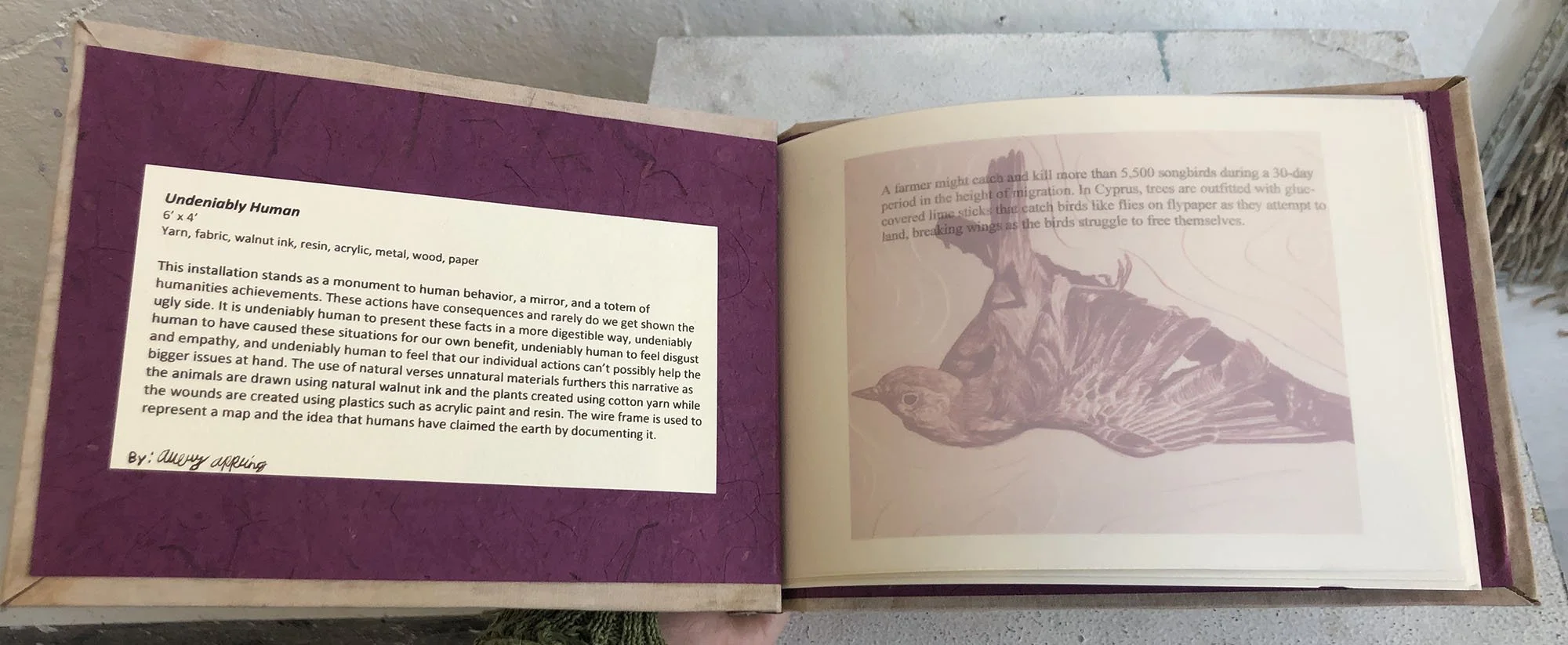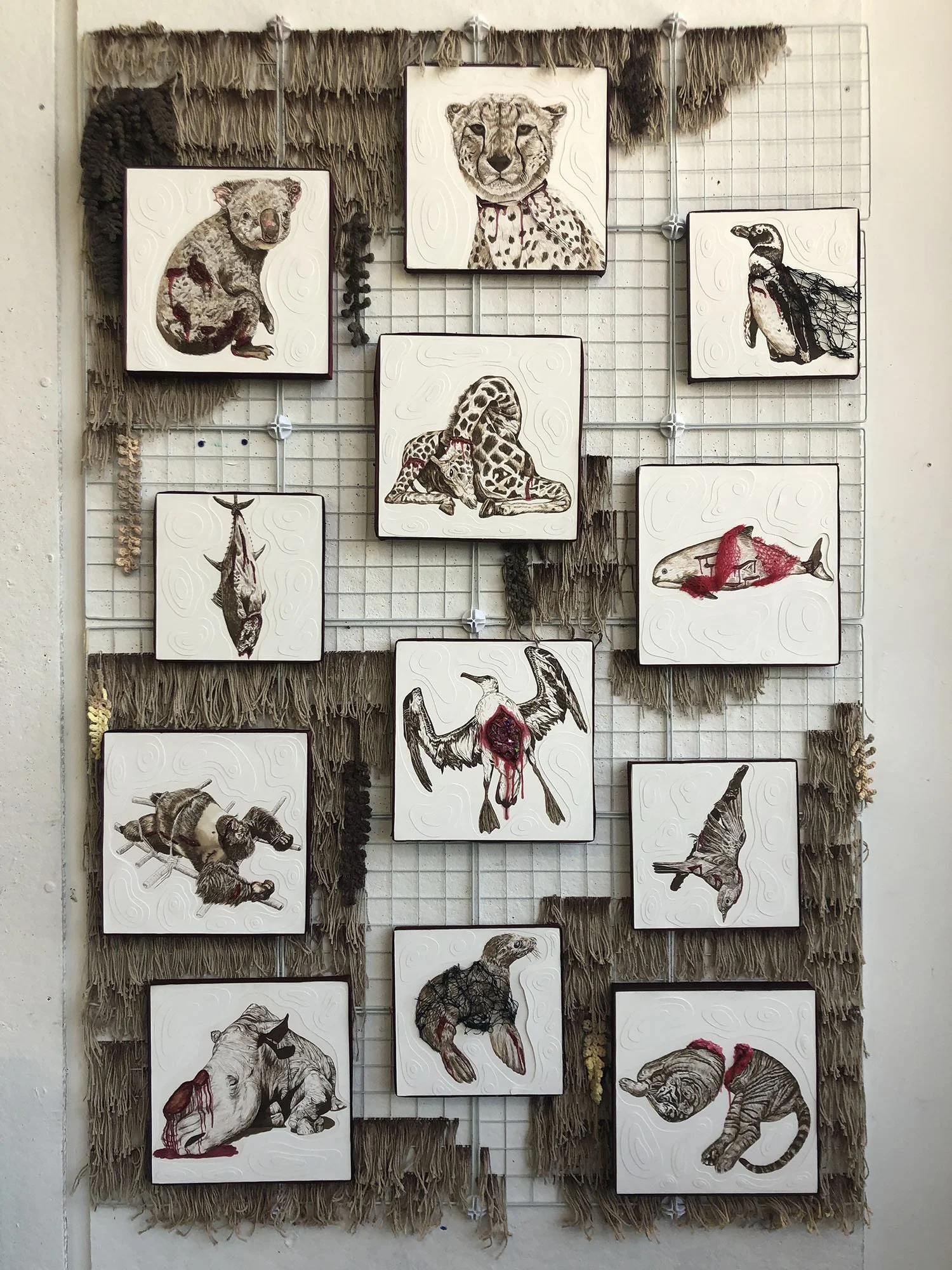 Undeniably Human6’ x 4’ installation with 12” x 12” and 10” x 10” imagesPaper, Walnut ink, Acrylic paint, Resin, Plastic, Cotton yarn, Metal, Fabric dye, Silk